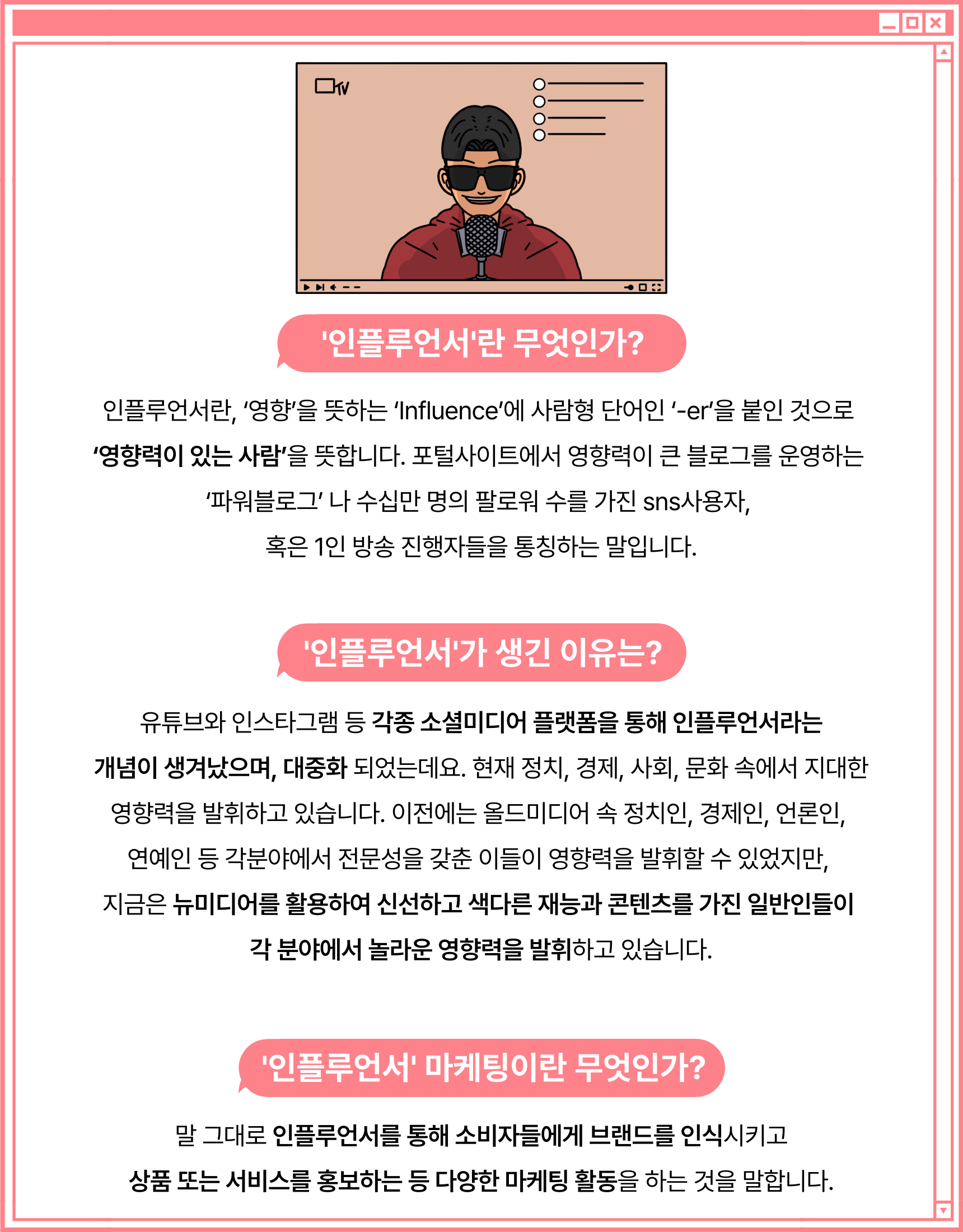 '인플루언서 마케팅'이란 말을 들어 보신 적 있으신가요? 최근 인터넷을 통한 정보교류 수단의 발전으로 블로그 및 각종 SNS를 통한 광고는 더더욱 다양한 형태로 활발히 진행되고 있는데요. 그중, 인플루언서 마케팅은 기업의 새로운 광고 수단으로 떠오르고 있습니다.