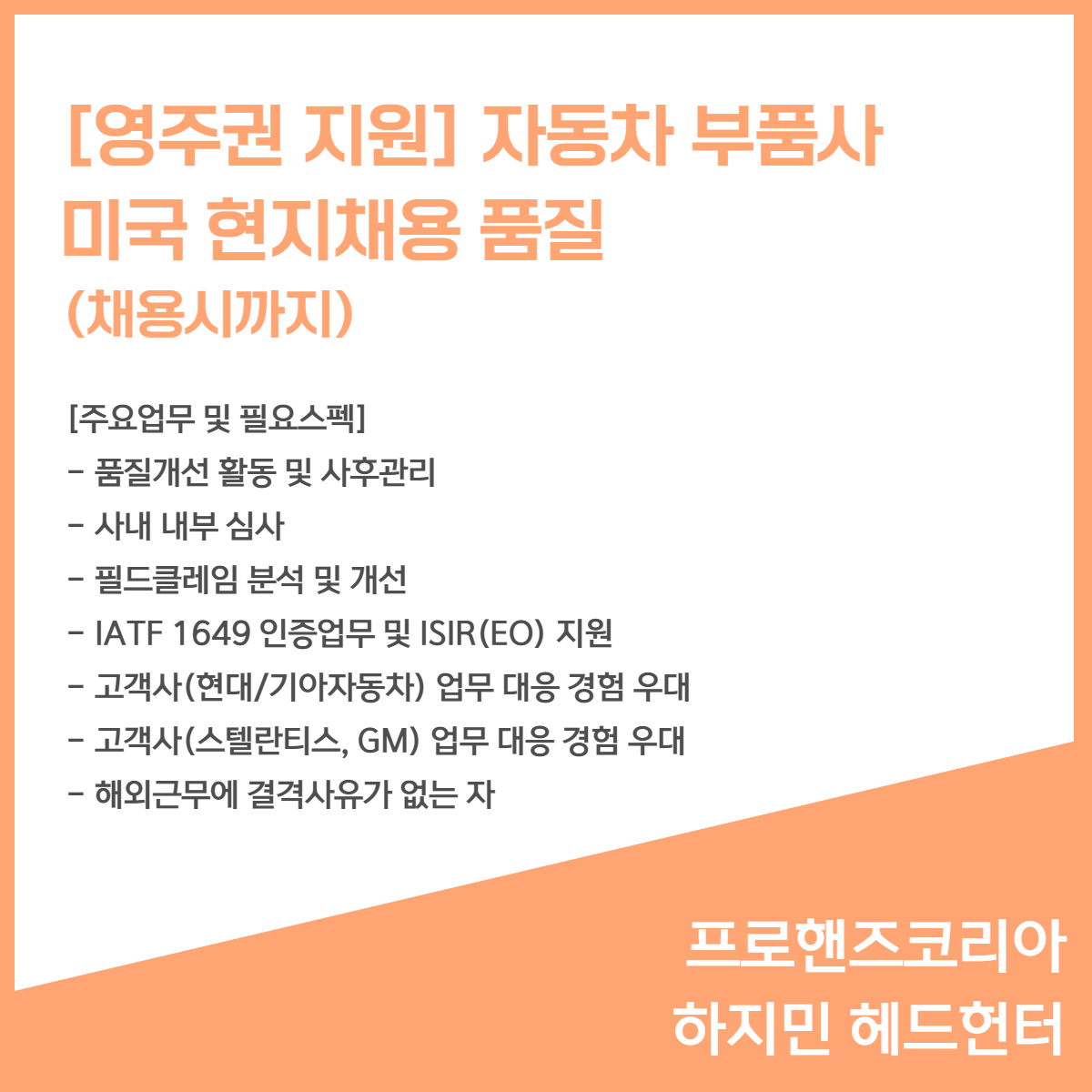 📣 [영주권지원] 자동차부품사 미국 현지채용 품질 (채용시까지)