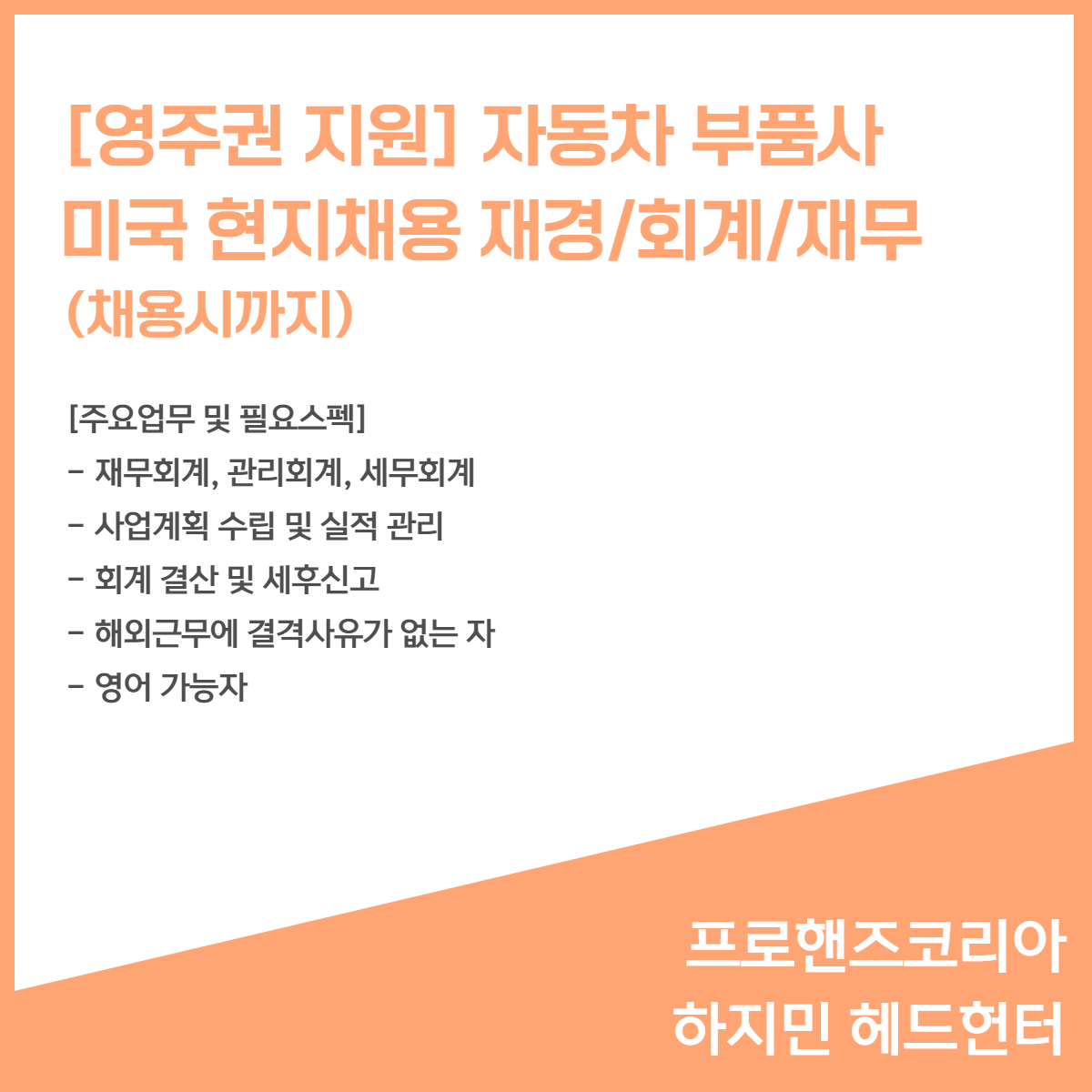 📣 [영주권지원] 자동차부품사 미국 현지채용 재경/회계/재무 (채용시까지)