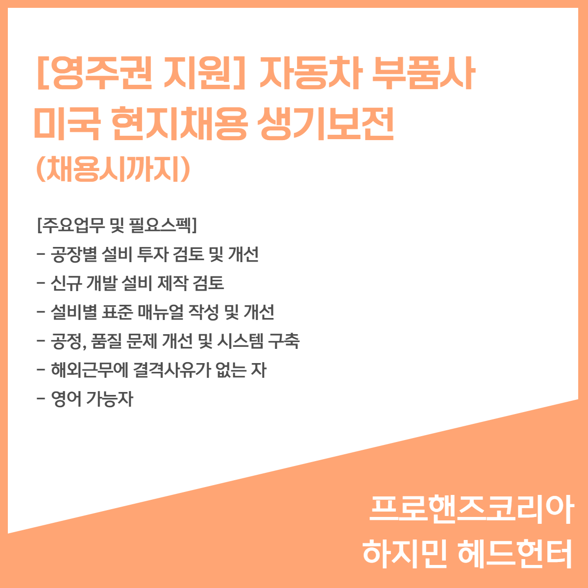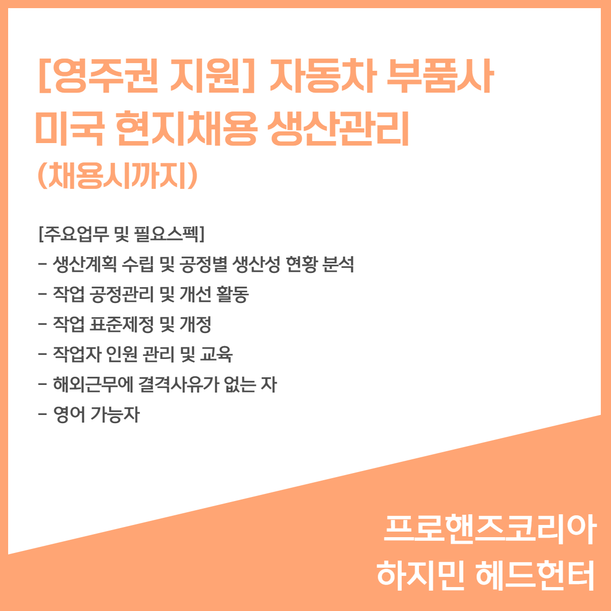 📣 [영주권지원] 자동차부품사 미국 현지채용 생산관리 (채용시까지
