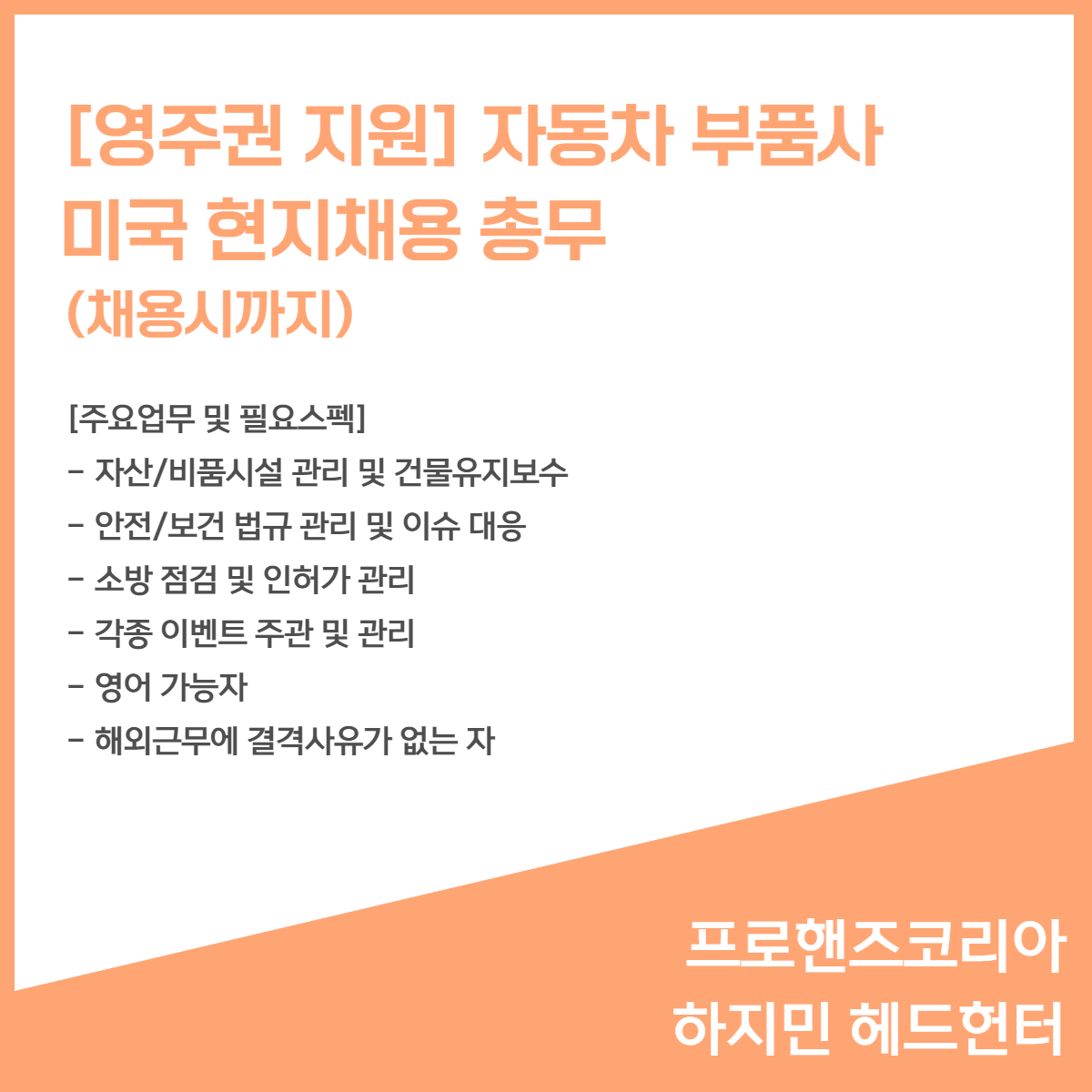 📣 [영주권지원] 자동차부품사 미국 현지채용 총무 (채용시까지)