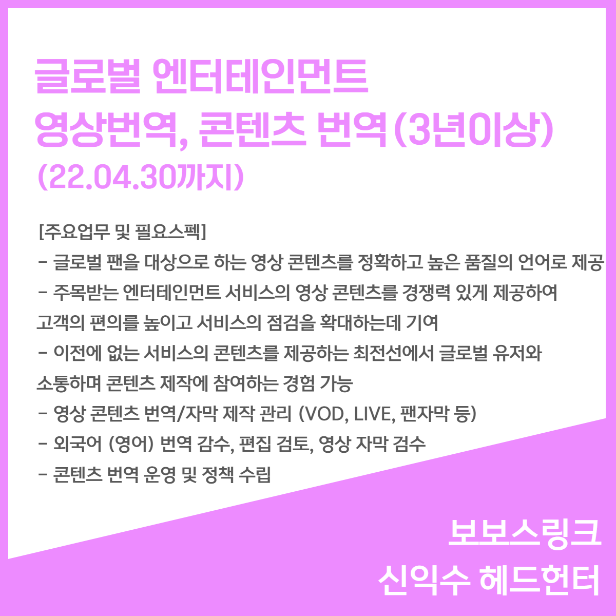 📢 [글로벌 엔터테인먼트] - 영상번역, 3년이상(22.04.30까지)