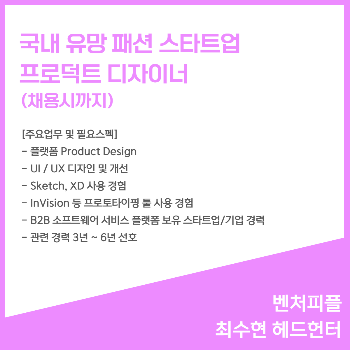 채용을 진행 중인 헤드헌터분들은 벤처피플 최수현 헤드헌터 / 보보스링크 신익수 헤드헌터 / 유엔이커뮤니케이션즈 입니다.