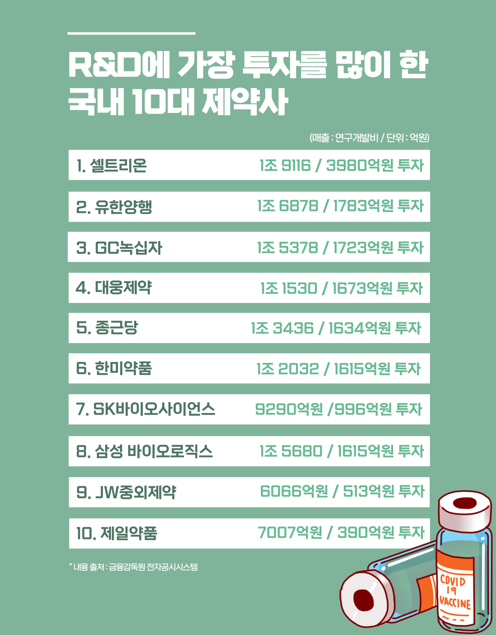 R&D(연구개발)에 가장 투자를 많이 한 '국내 10대 제약사' 순위