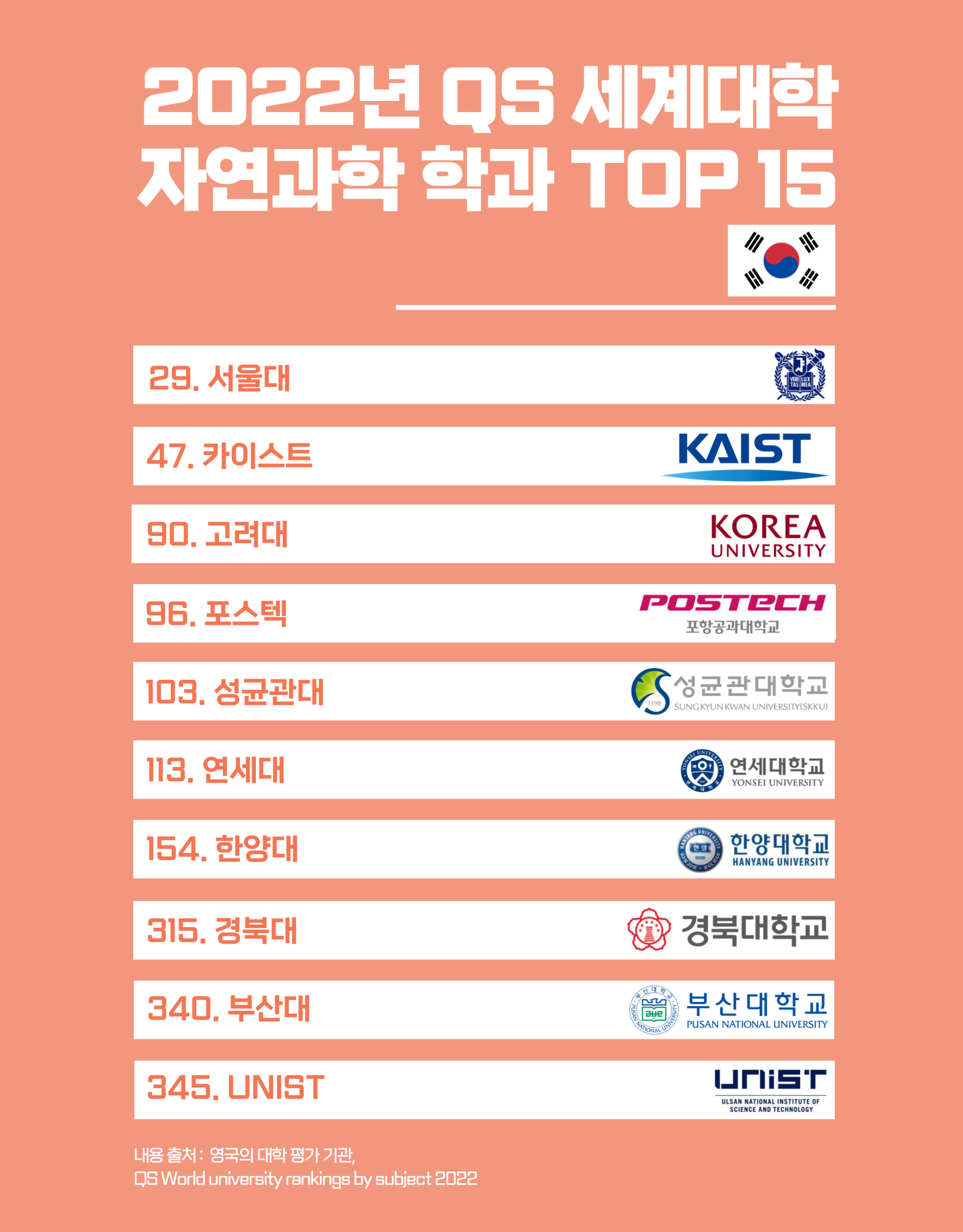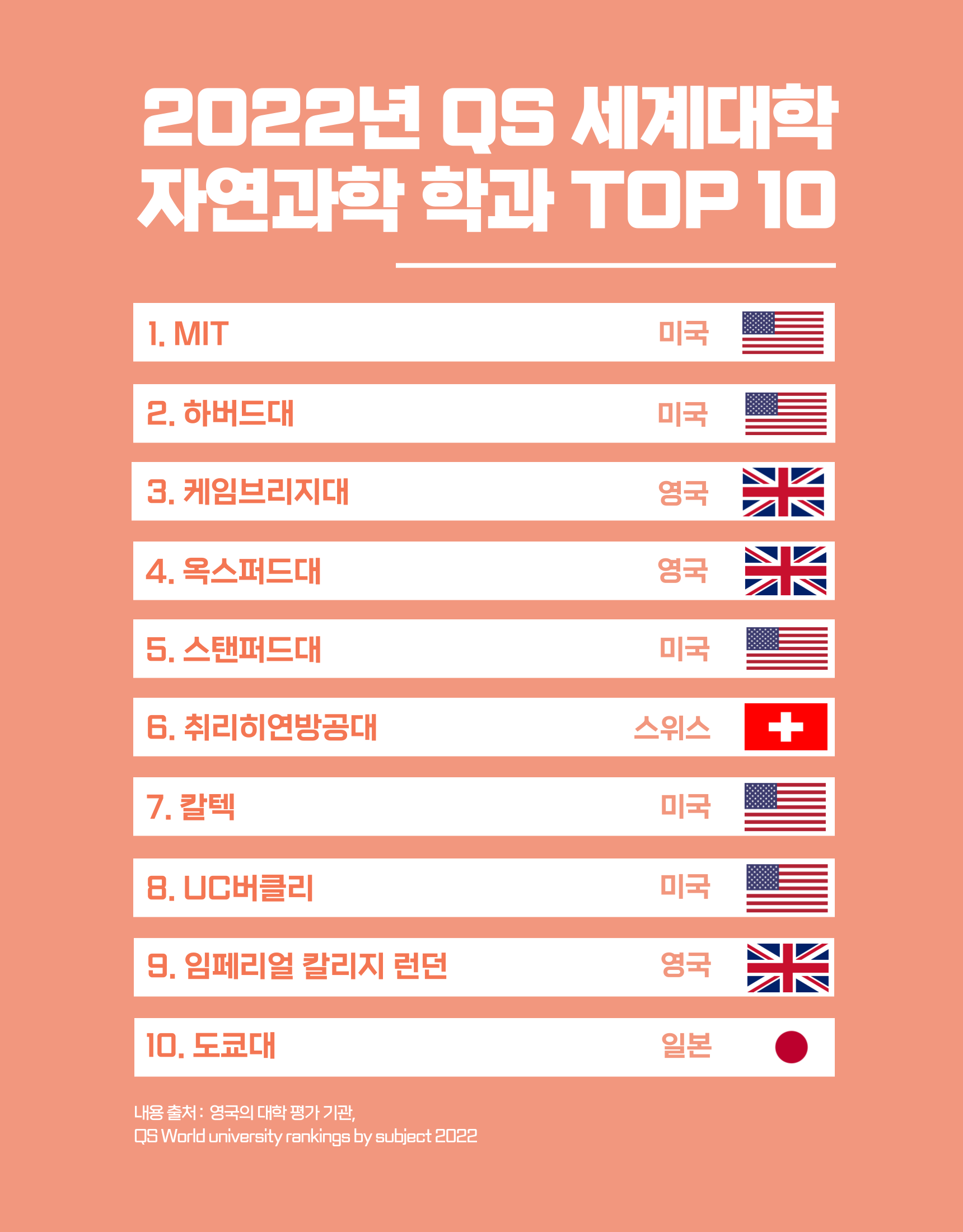 2022년 QS 세계대학 자연과학학과 TOP 10 (+국내대학)