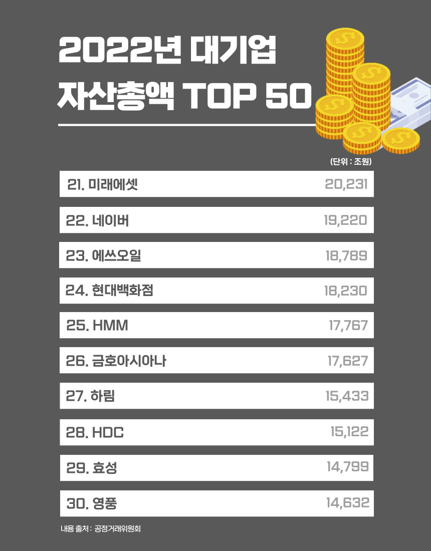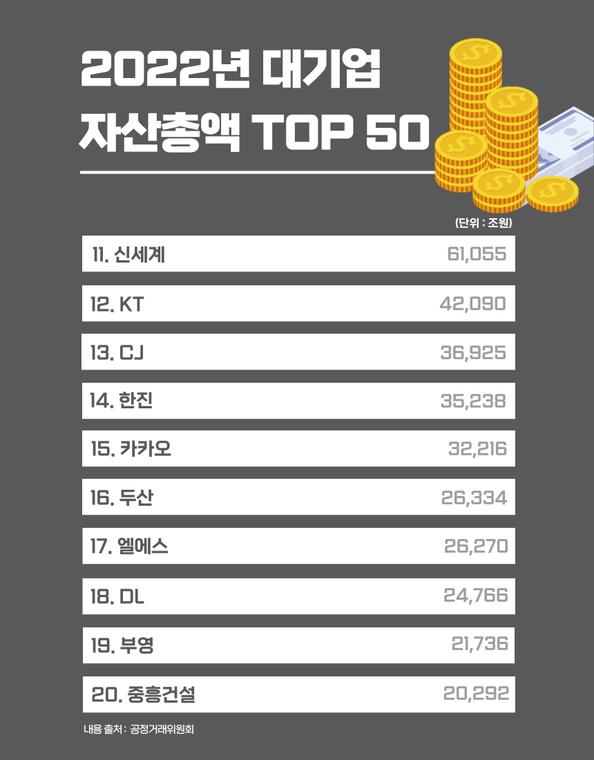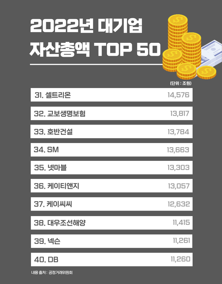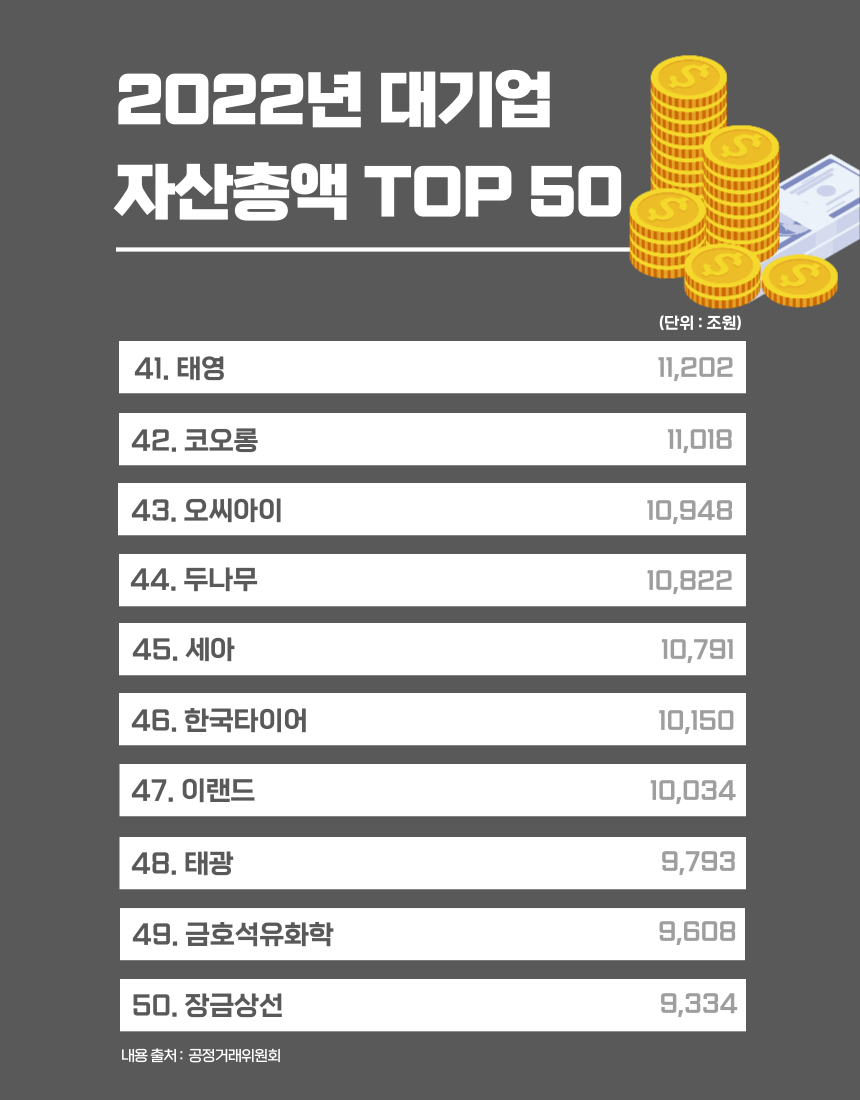 공정 자산 기준으로 자산 총액이 5조 원 이상인 공시 대상 기업집단은 총 76곳으로 지난해보다 5곳 늘었으며, 자산 총액이 10조 원 이상인 상호출자 제한 기업집단은 지난해보다 7곳 증가해 총 47곳입니다.