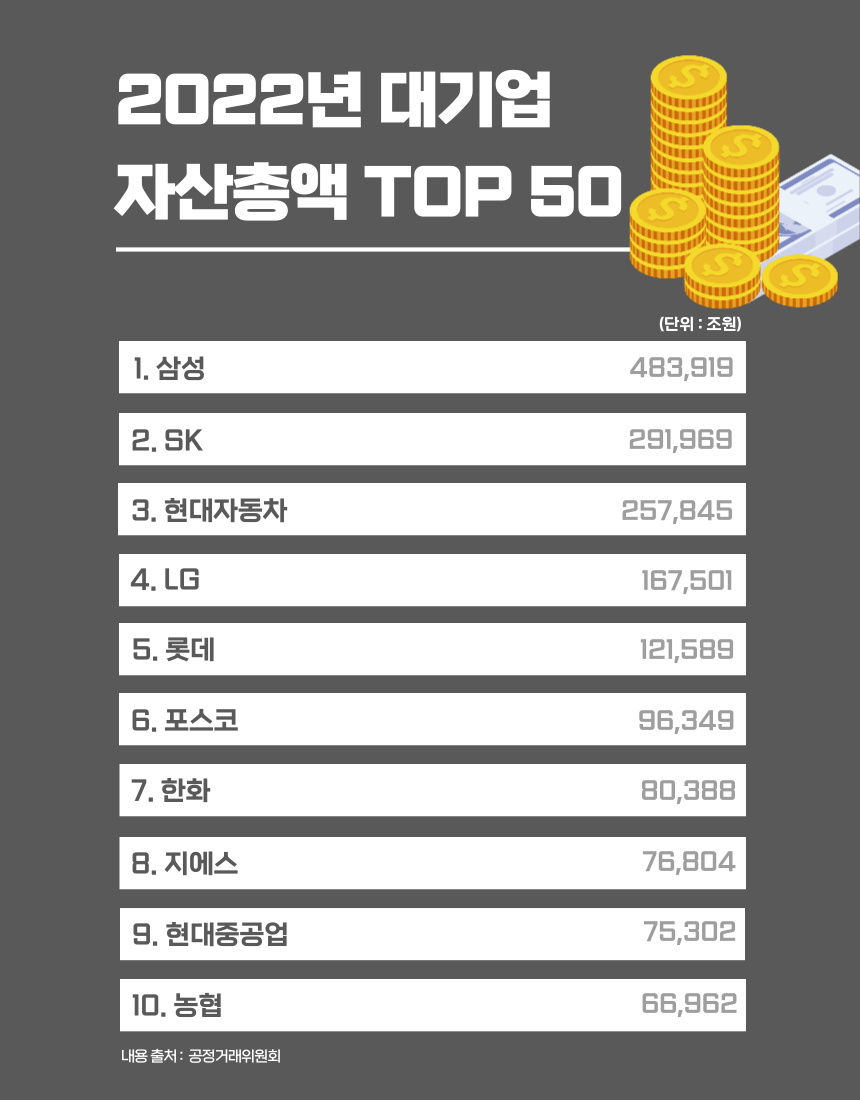 2010년 이후 삼성, 현대자동차, SK, LG, 롯데 순으로 변동이 없던 자산총액 순위가 12년 만에 바뀌게 되었습니다.