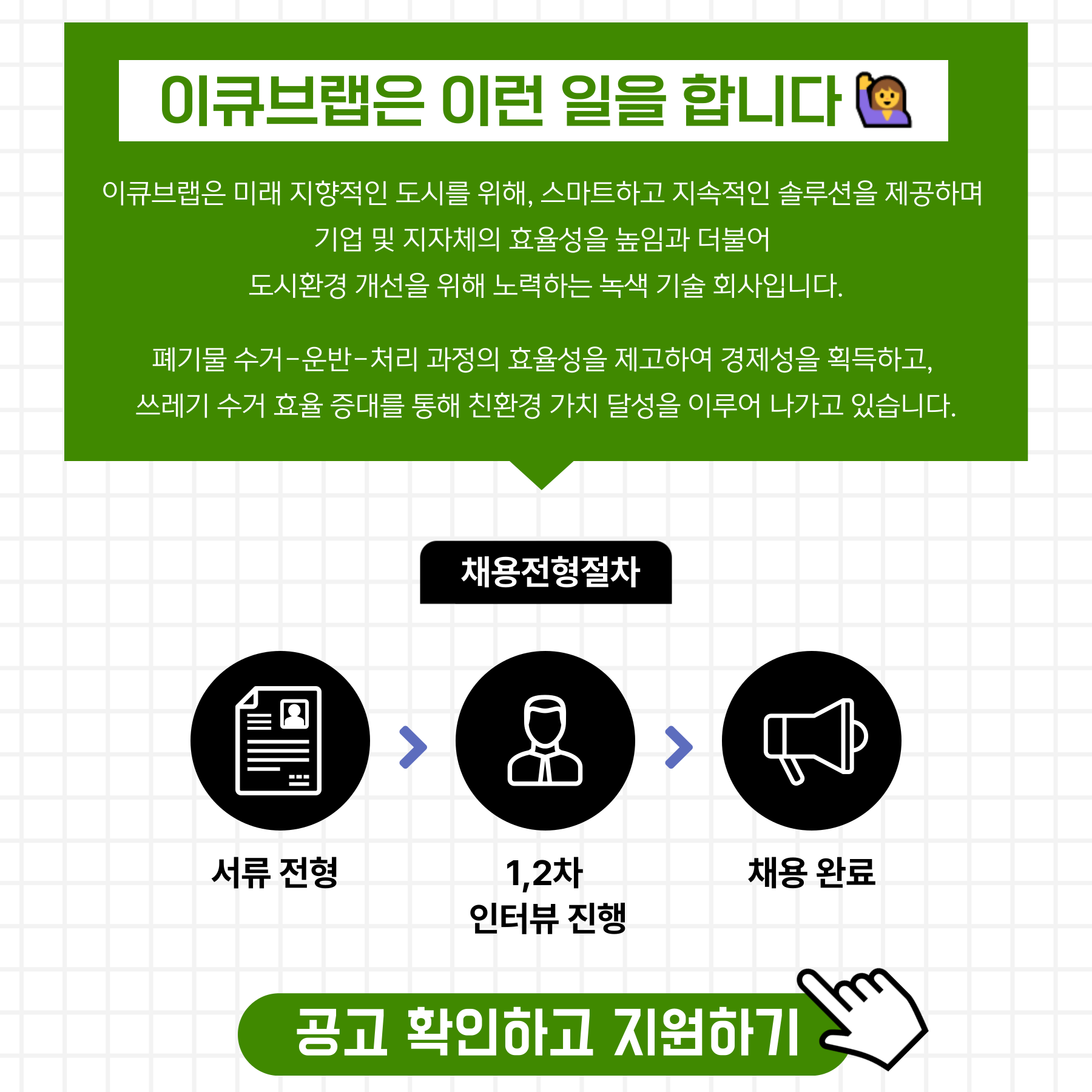 스마트 폐기물 관리 솔루션, 이큐브랩(EcubeLabs)에서 Operations Team Leader, 해외 신사업 영업기획 / 관리 담당자, Global Business Development 담당자를 모집한다고 합니다.