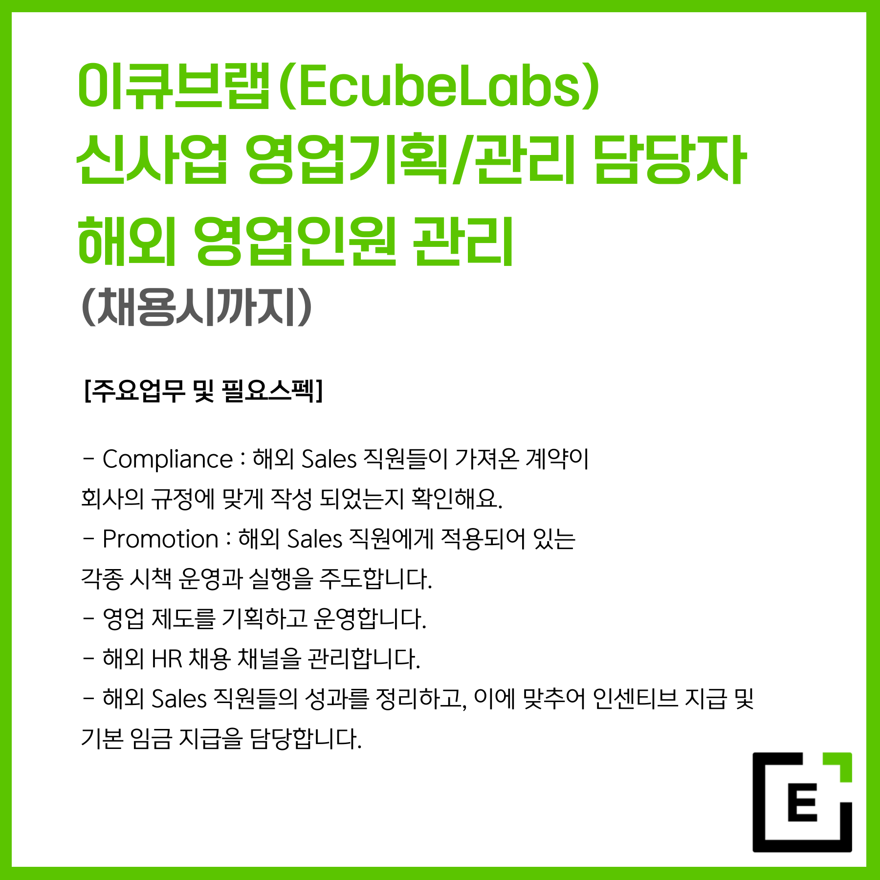 📣 [이큐브랩 EcubeLabs] - 해외 신사업 영업기획/관리 담당자(해외 영업인원 관리) (채용시까지)