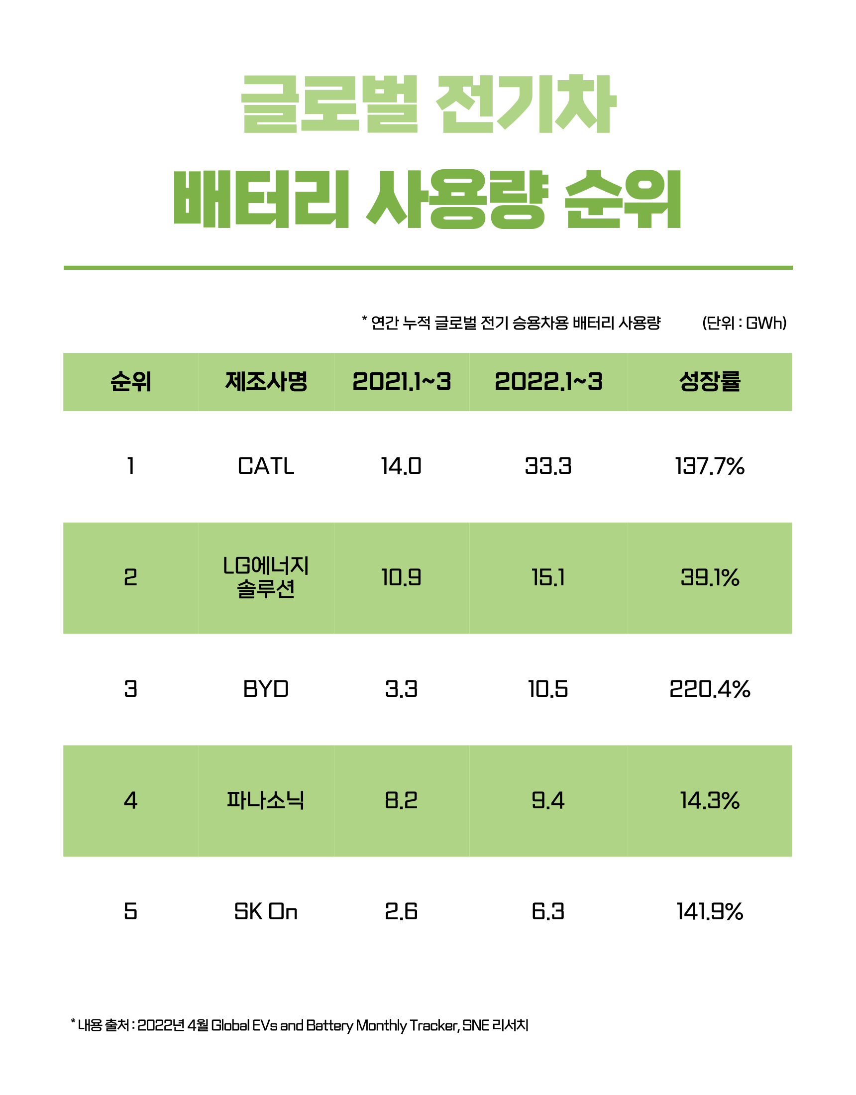 또한, 2022년 3월 판매된 글로벌 전기차 탑재 배터리 사용량 순위에서 세계 최대 배터리 회사인 중국 CATL(寧德時代·닝더스다이)이 1위를 차지했으며, LG에너지솔루션은 2위, SK온은 5위를 차지했는데요,