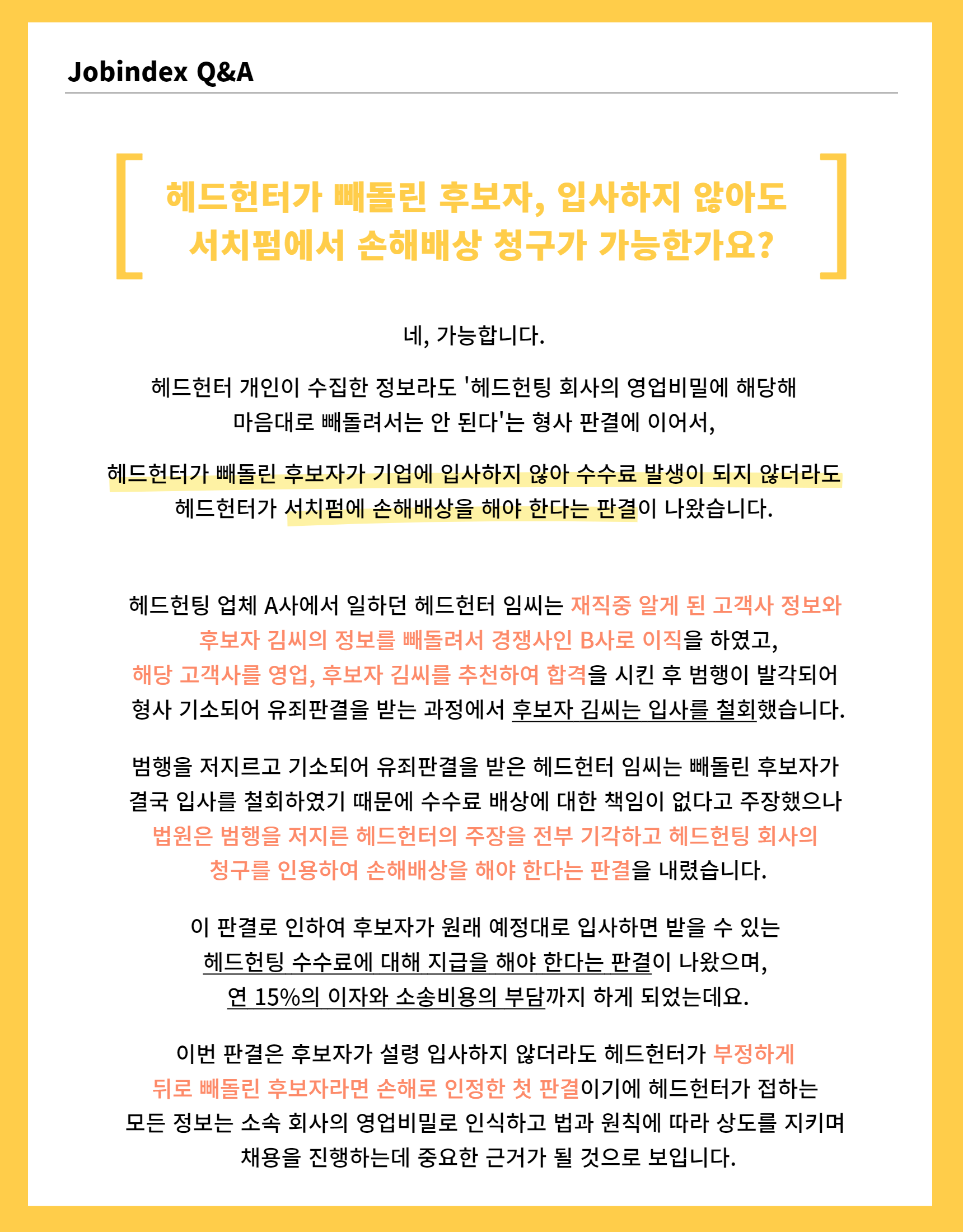 헤드헌터 개인이 수집한 정보라도 '헤드헌팅 회사의 영업비밀에 해당해 마음대로 빼돌려서는 안 된다'는 형사 판결에 이어서, 헤드헌터가 빼돌린 후보자가 기업에 입사하지 않아 수수료 발생이 되지 않더라도 헤드헌터가 서치펌에 손해배상을 해야 한다는 판결이 나왔습니다.