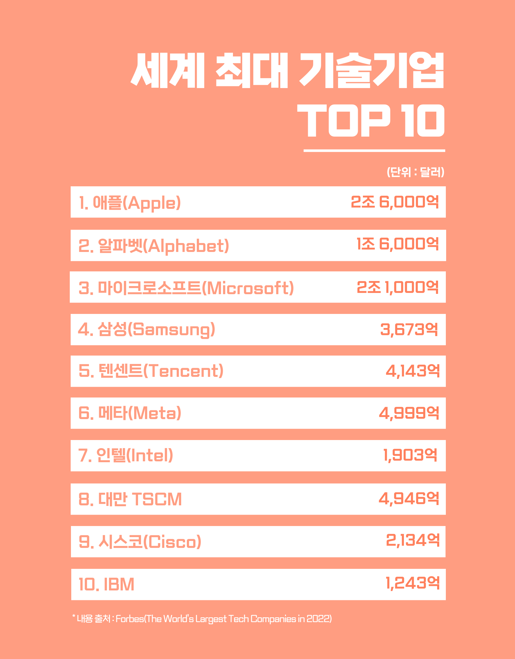 한편 1위는 지난해에 이어 또 애플이 차지했으며 2위에는 구글의 모회사인 알파벳, 3위는 마이크로소프트, 5위는 텐센트, 6위는 메타, 7위는 인텔, 8위는 대만 TSMC, 9위는 시스코, 10위는 IBM이 자리했습니다.