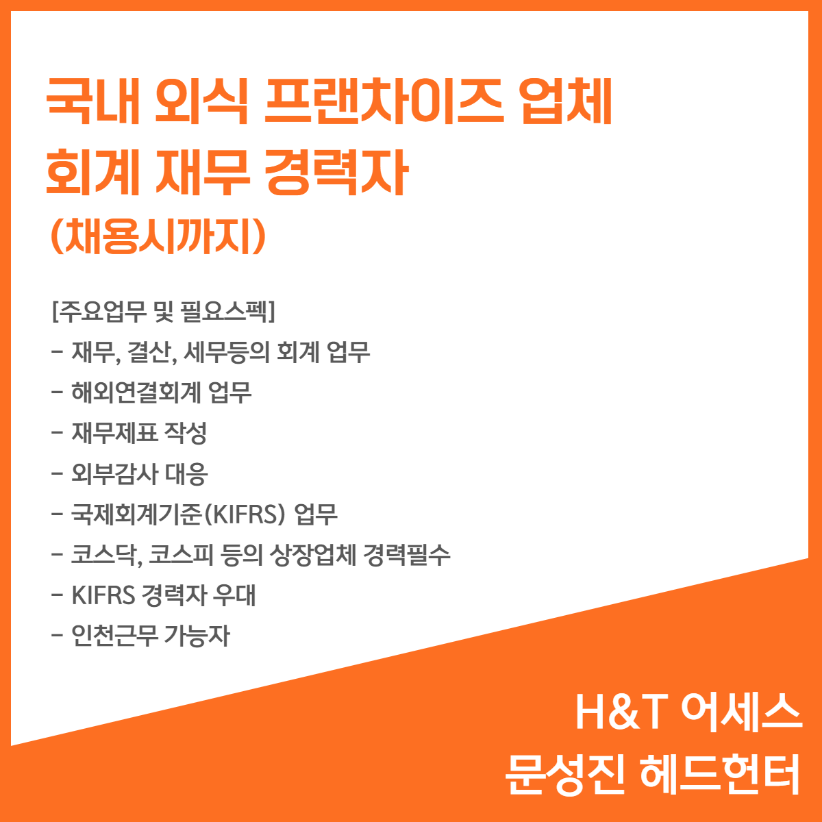 📢 [국내 외식 프랜차이즈업체] - 회계 재무 경력자(채용시까지)