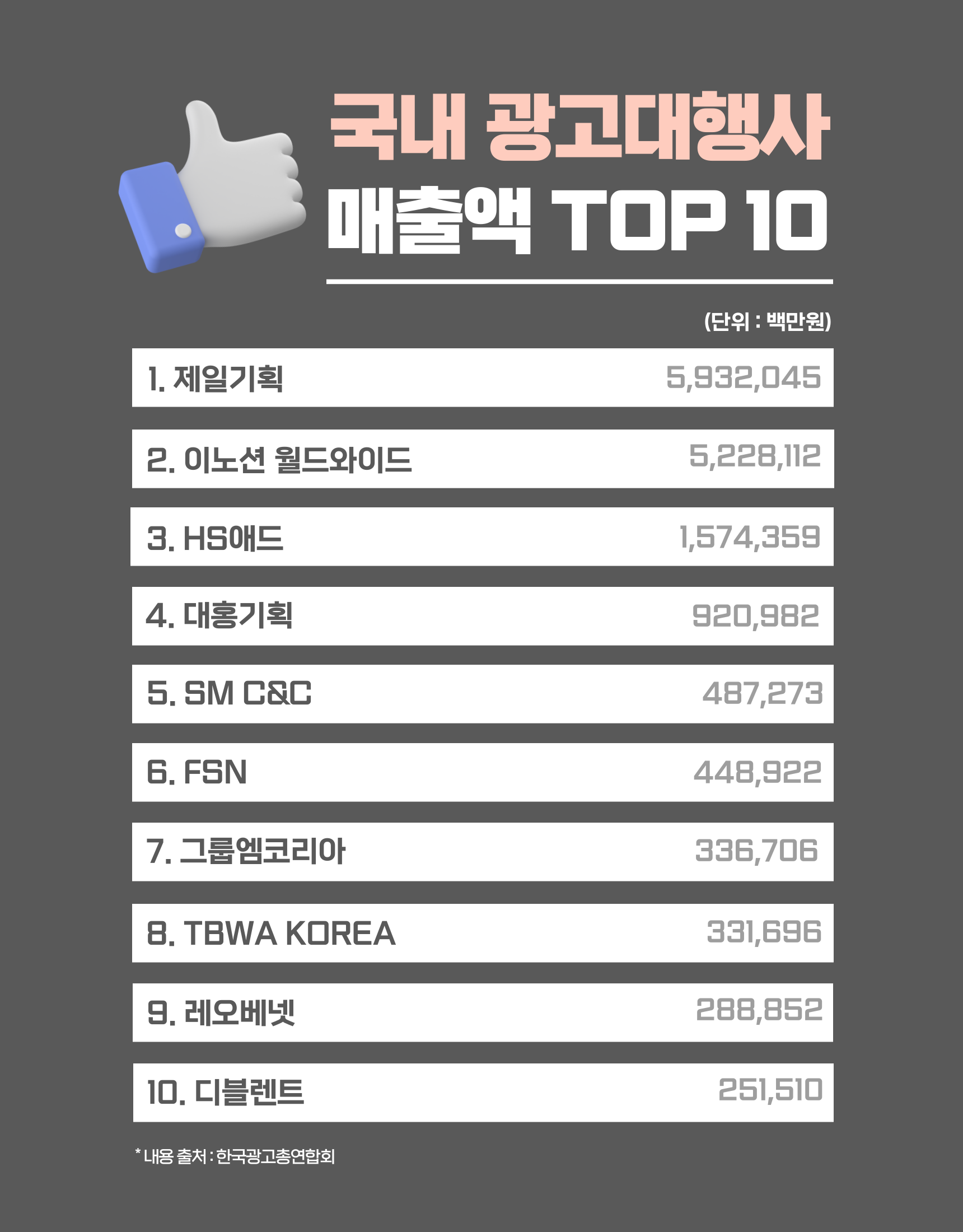 지난해 매출액은 제일기획이 29억 달러, 이노션월드와이드가 13억 달러였는데요, 아시아권에서는 순위변동이 없는 6위의 일본 덴츠와 10위 권 내로 진입한 9위 일본 하쿠호도에 이어 3,4위에 해당됩니다.