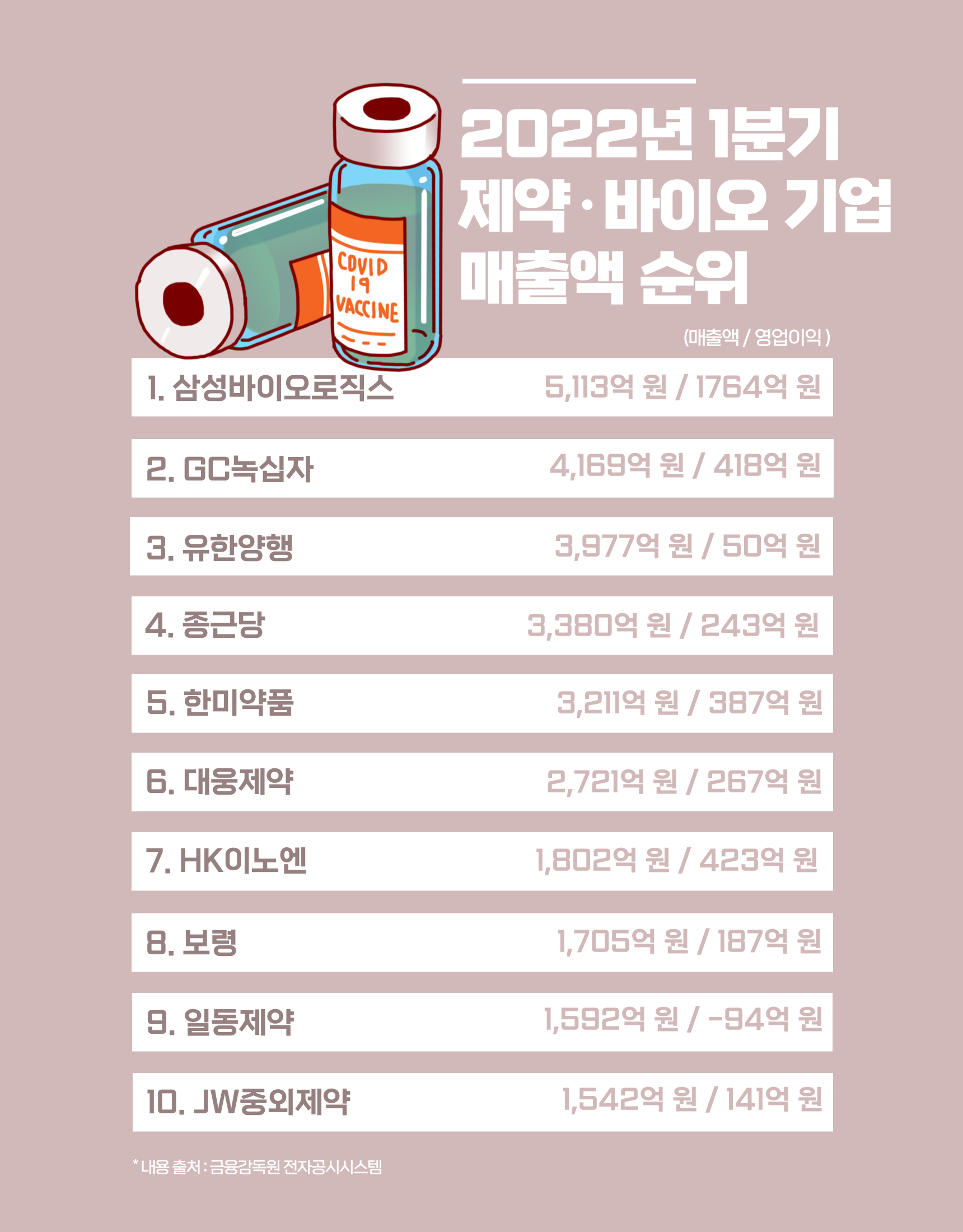 2022년 1분기 제약·바이오 기업 '매출 순위 TOP 10'(+영업이익)