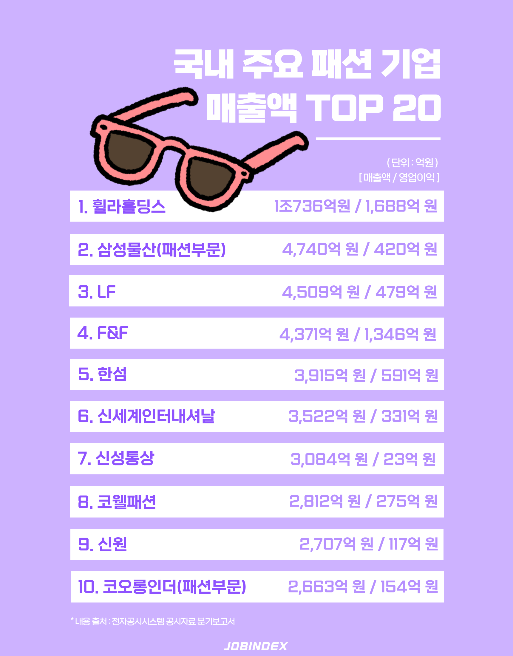 금융감독원의 전자공시시스템에 따르면 매출 상위 5위권 기업에는 휠라홀딩스, 삼성물산 패션부문, LF, F&F, 한섬이 이름을 올렸으며, 패션 전체의 절반(50.4%)이 매출로 차지했고 영업이익은 74.4%를 차지하면서 패션 기업들의 매출 성장세는 올해 2분기부터 더욱 본격화 할 것으로 전망됩니다:)