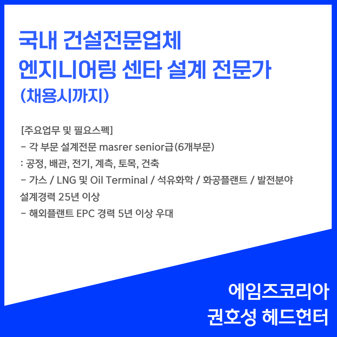 📢 [국내 건설전문업체] - 엔지니어링센타 설계 6개부문 전문가(채용시까지)