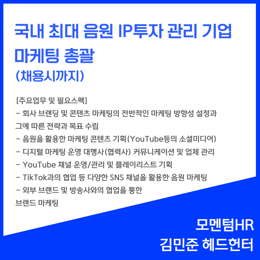 📢 [국내 최대 음원 IP투자 관리 기업] - 마케팅총괄(채용시까지)