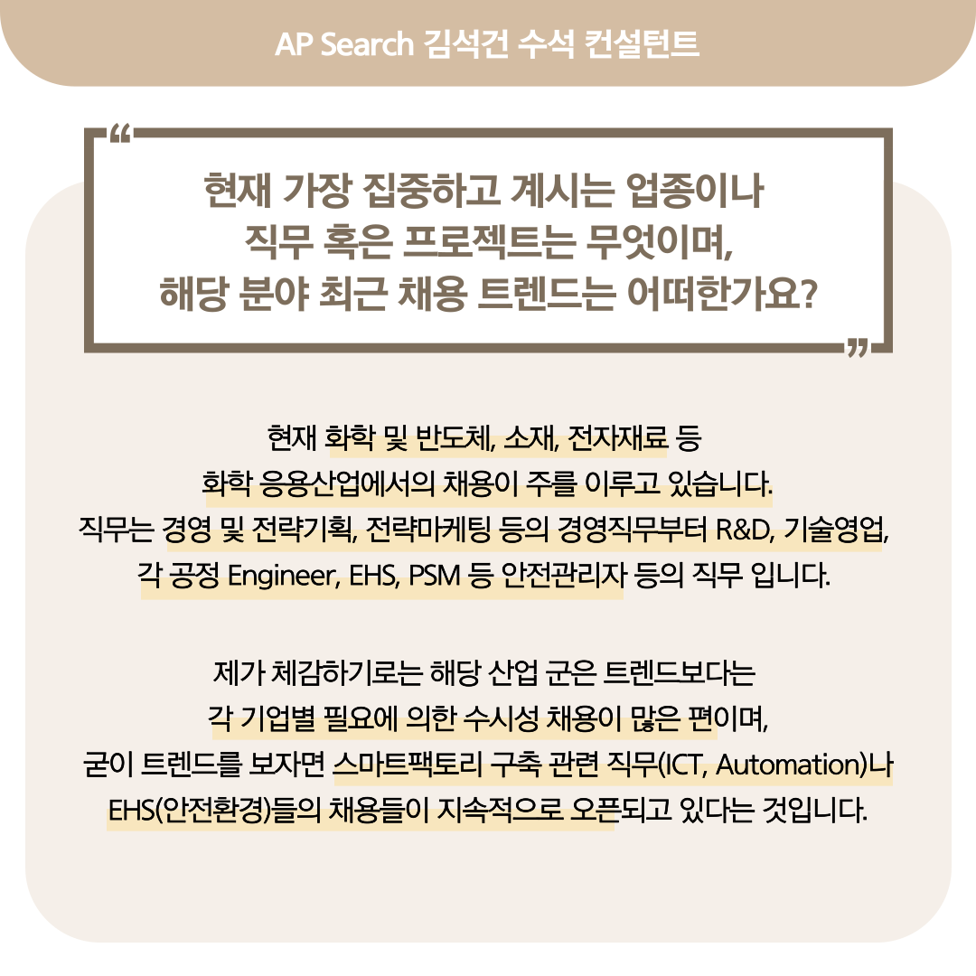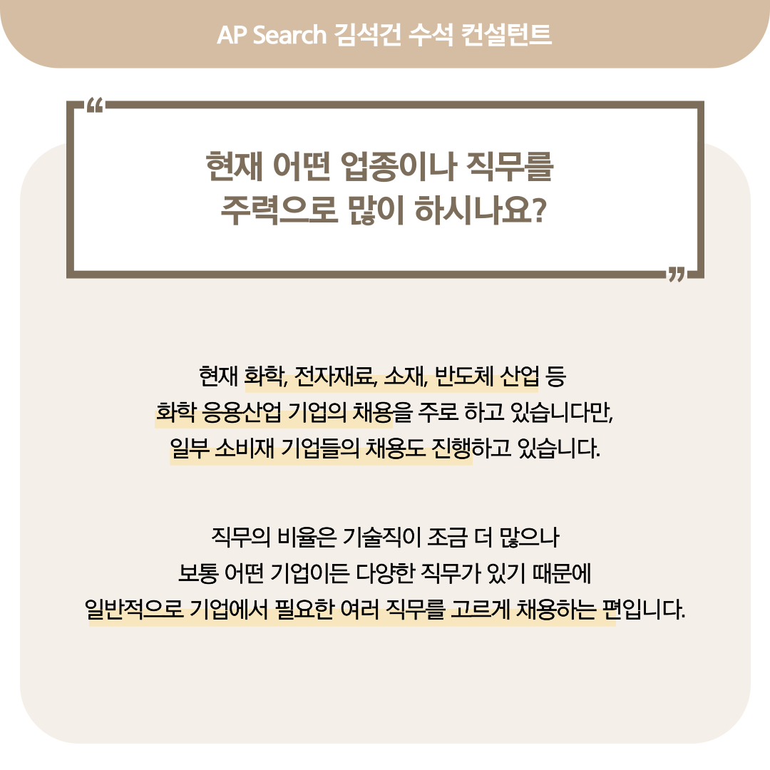 김석건 헤드헌터님은 현재 화학, 전자재료, 소재, 반도체 산업 등 화학 응용산업 기업의 채용을 주로 하고 있습니다.