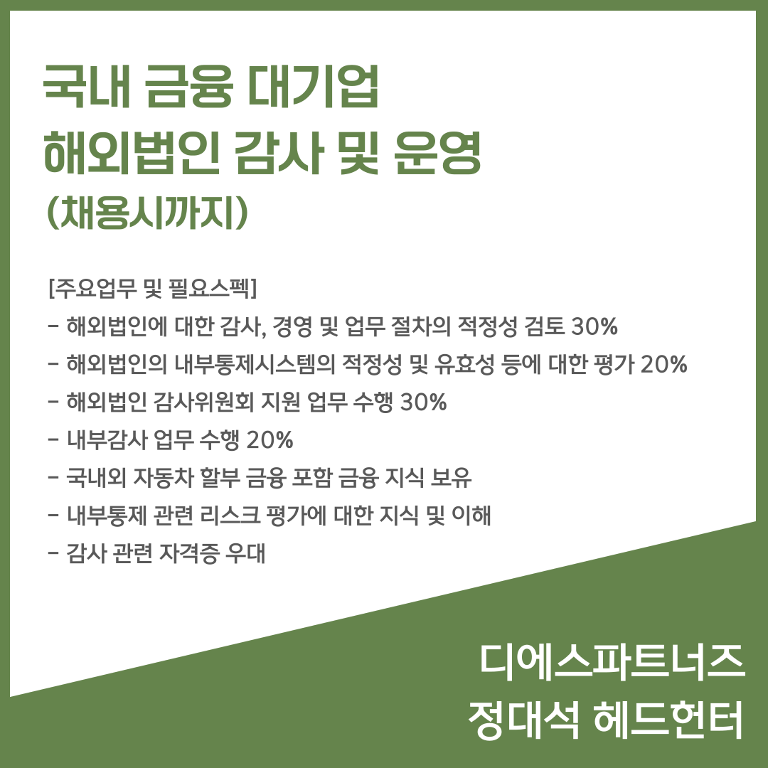 📢 국내 금융 대기업 - 해외법인 감사 및 운영(채용시까지)