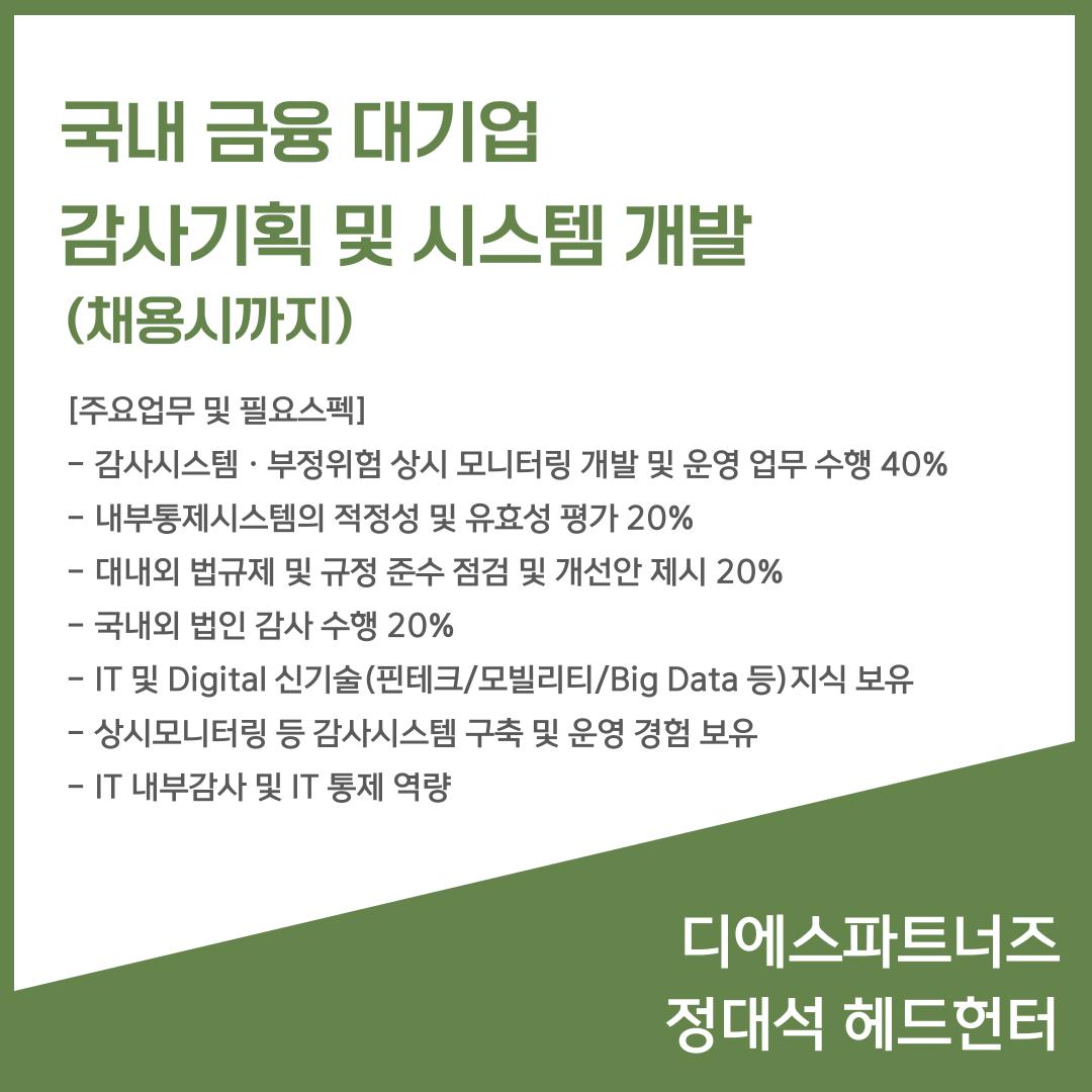 📢 국내 금융 대기업 - 감사기획 및 시스템 개발(채용시까지)