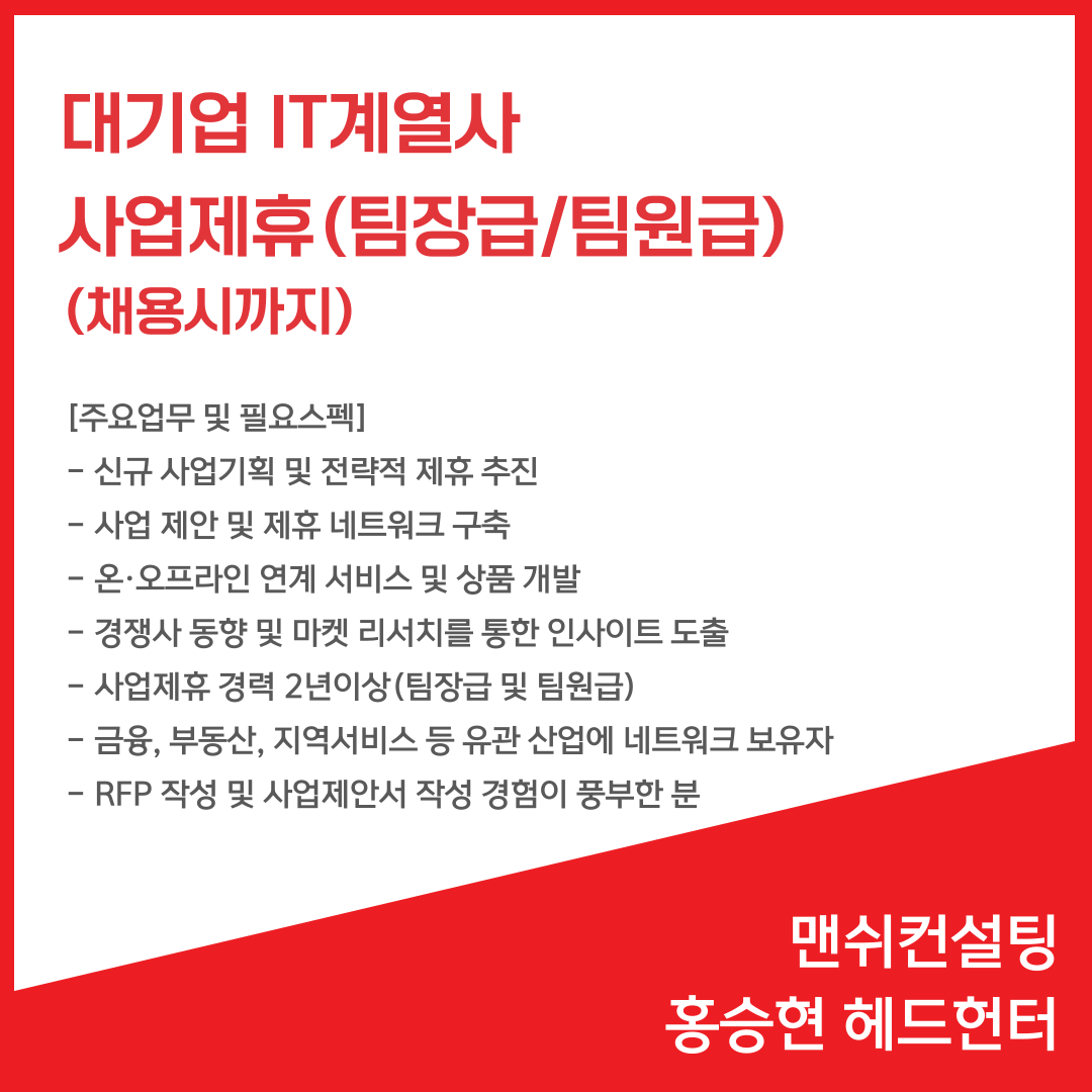 오늘은 IT, 전기전자, 소비재, 제조업 분야를 전문으로 진행하는 맨쉬컨설팅 홍승현 헤드헌터의 신규 채용소식을 가져왔습니다 :)