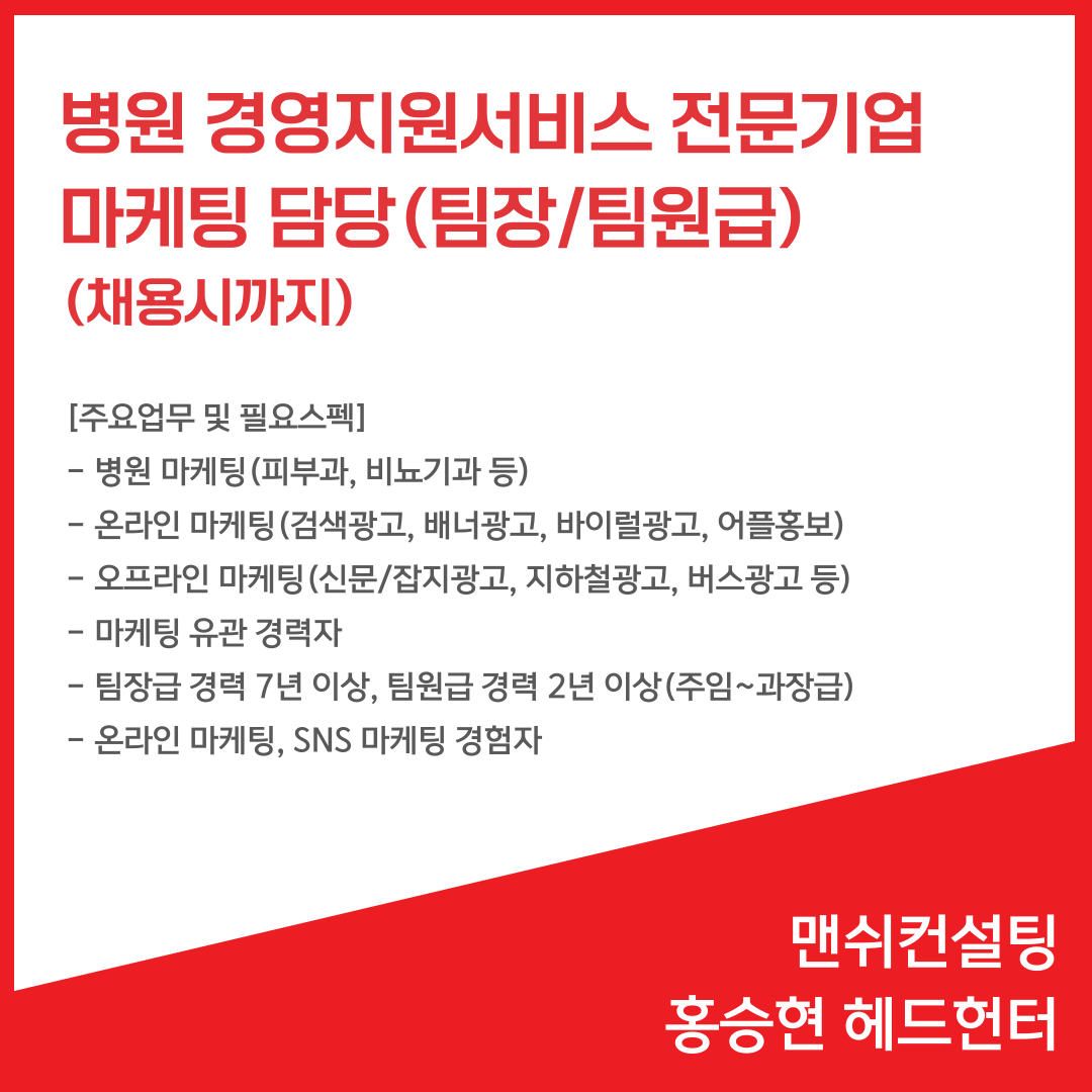 📢 병원 경영지원서비스 전문기업 - 병원 마케팅담당(채용시까지)