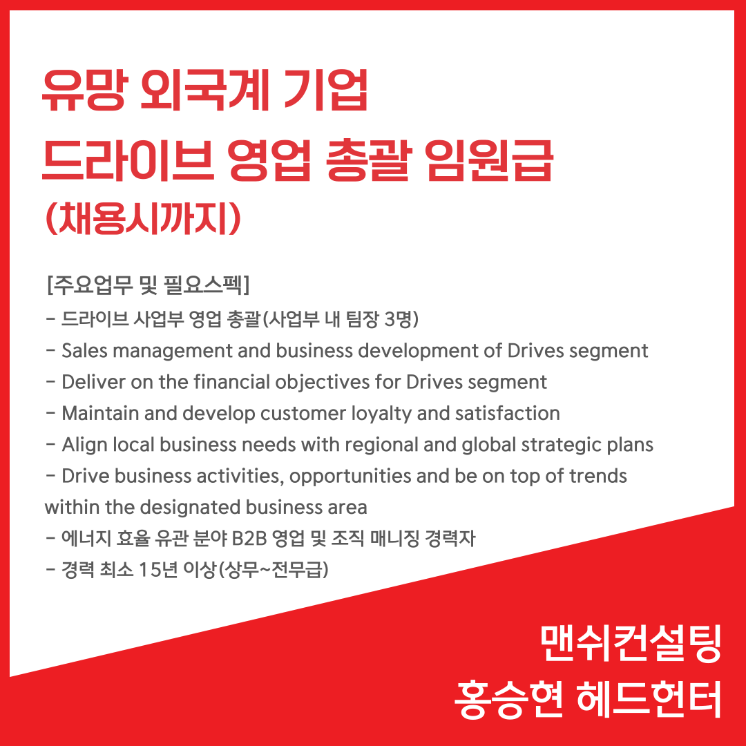 📢 유망 외국계 기업 - 드라이브 영업 총괄 임원급(채용시까지)