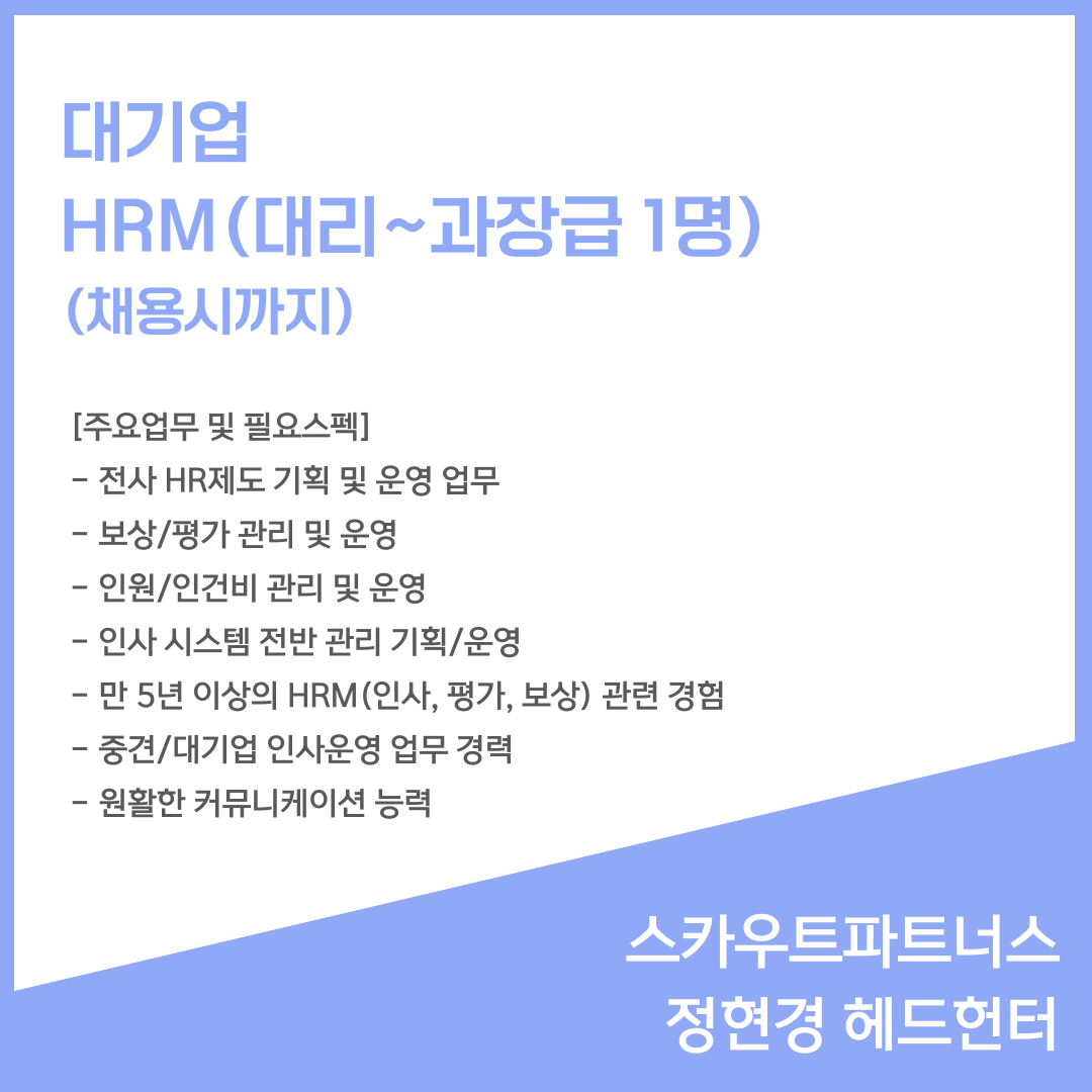 📢 [대기업] - HRM 대리~과장급 1명(채용시까지)