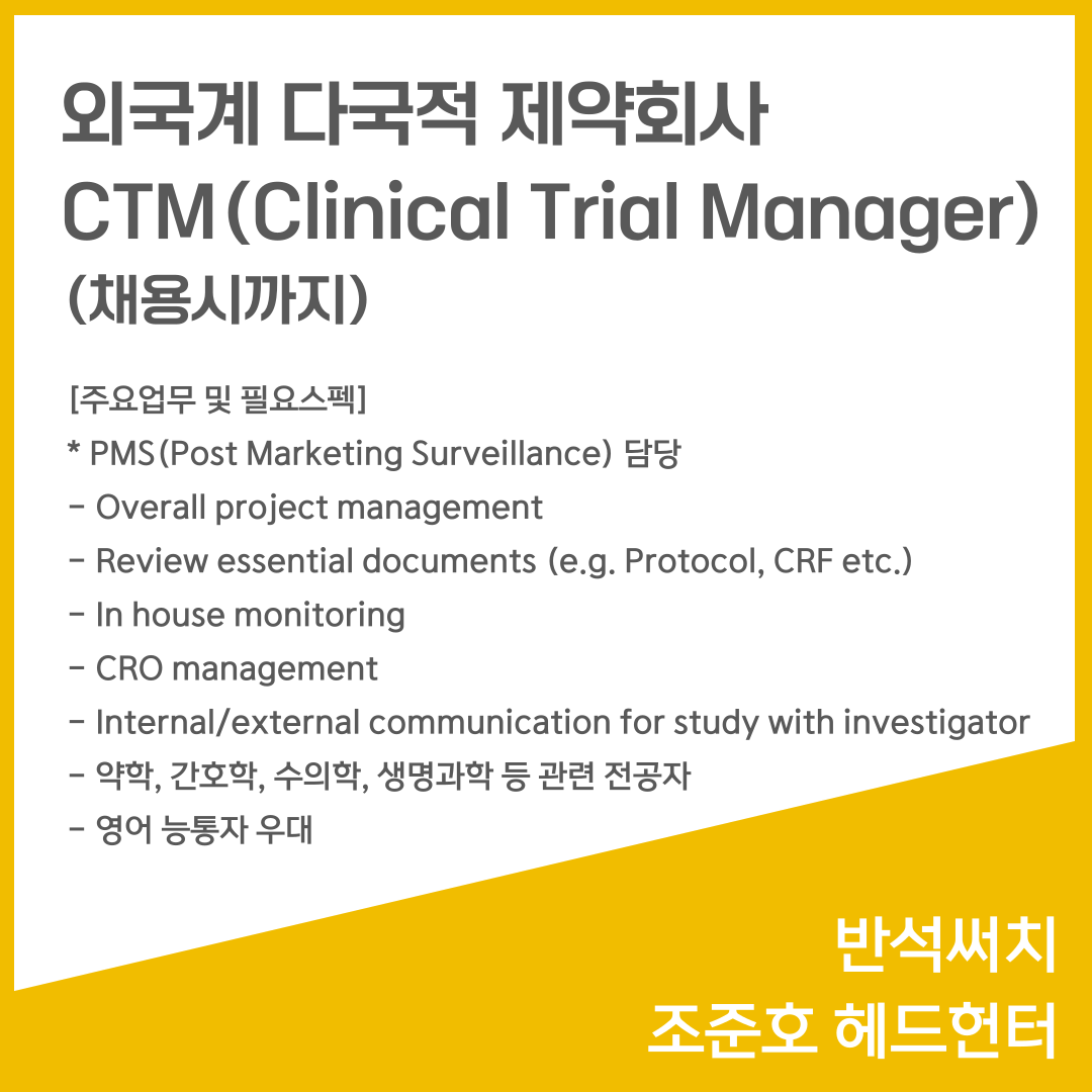 📣 [외국계 다국적 제약회사] - CTM (Clinical Trial Manager) (채용시까지)