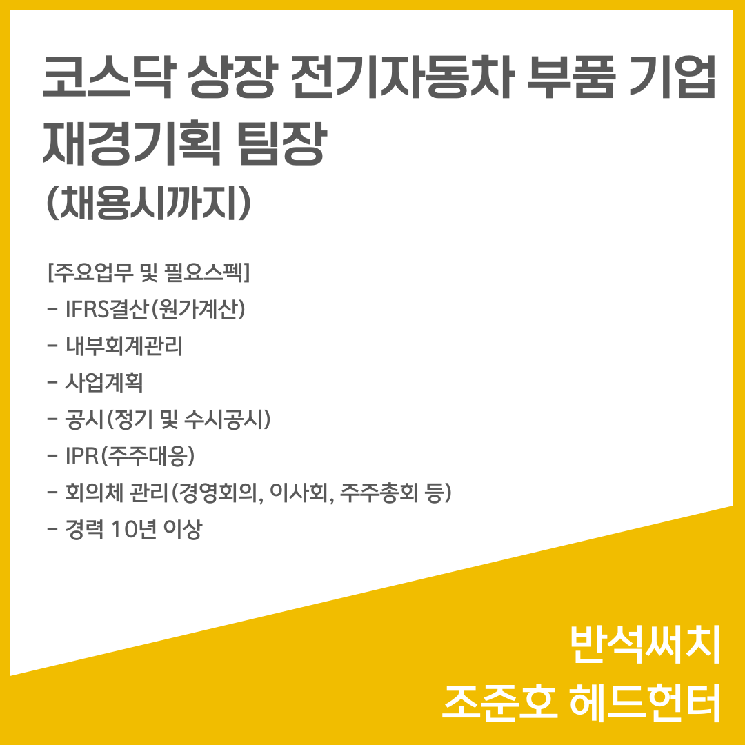 📣 [코스닥 상장 전기자동차 부품 기업] - 재경기획팀장(채용시까지)