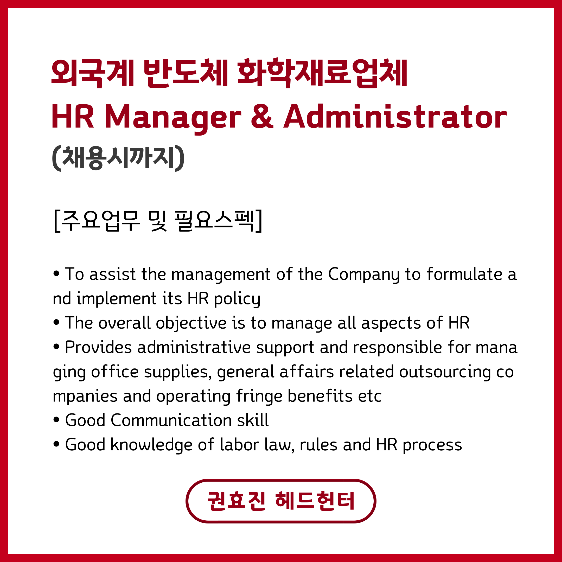 📢 [외국계 반도체 화학재료업체] - HR Manager & Administrator(채용시까지)