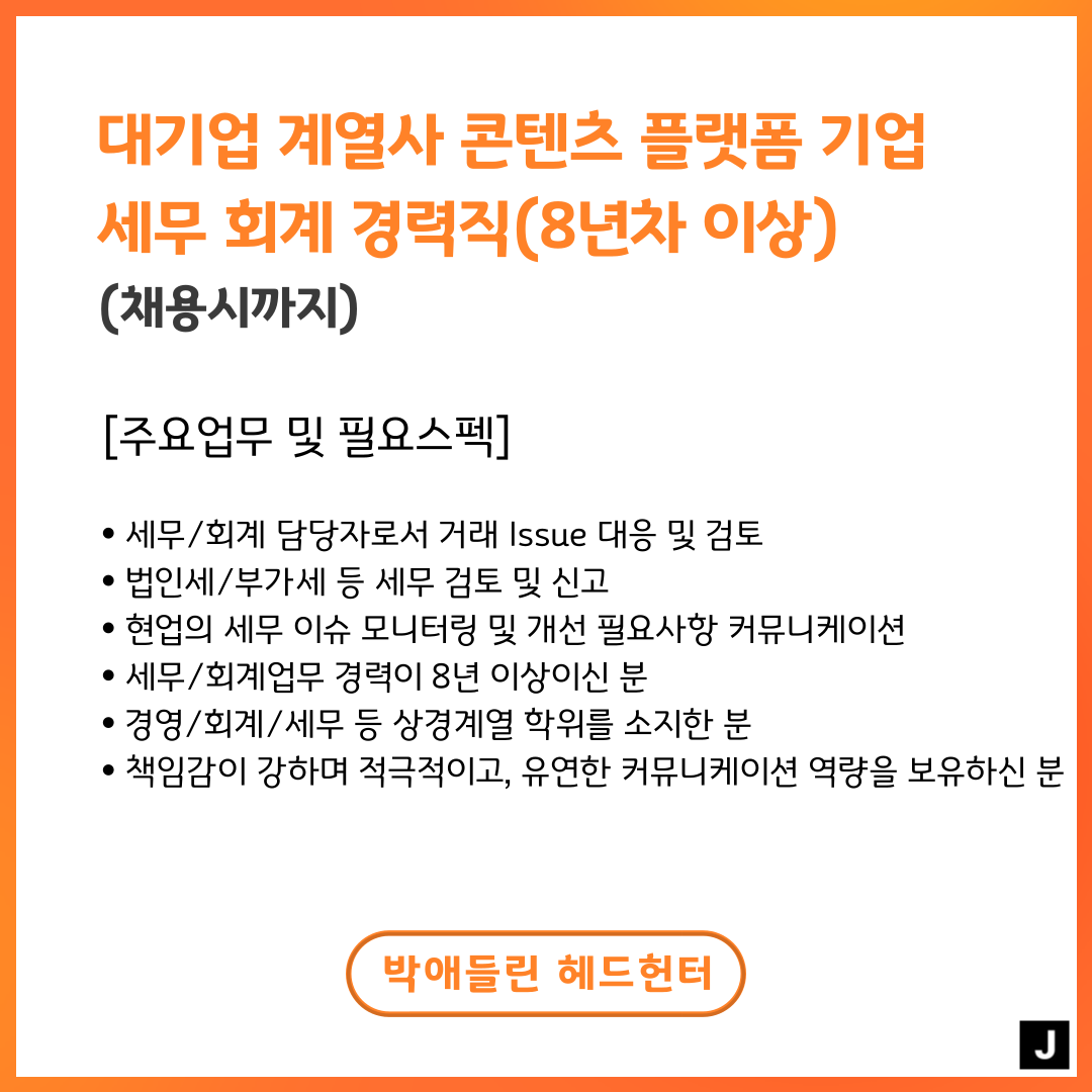 📢 [대기업 계열사 콘텐츠 플랫폼 기업] - 세무회계경력직, 8년차 이상(채용시까지)