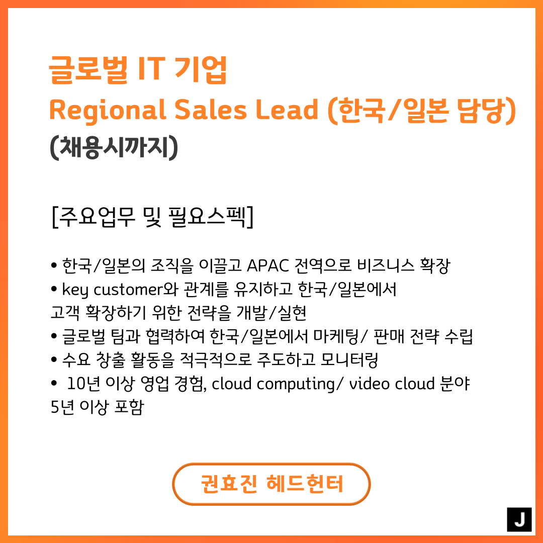 📢 [글로벌 IT 기업] - Regional Sales Lead(한국/일본 담당)(채용시까지)