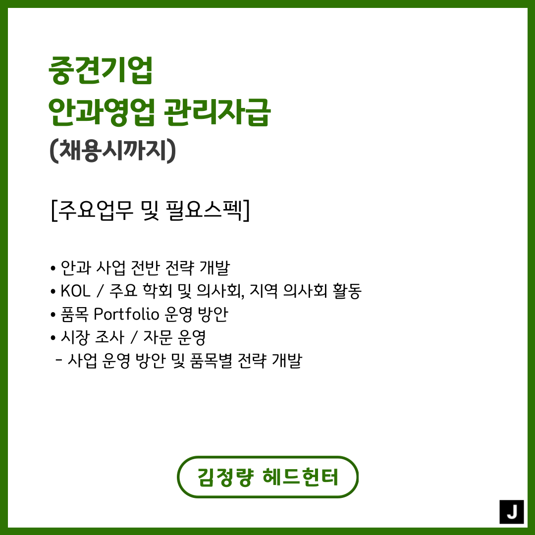 📢 [중견기업] - 안과영업 관리자급(채용시까지)